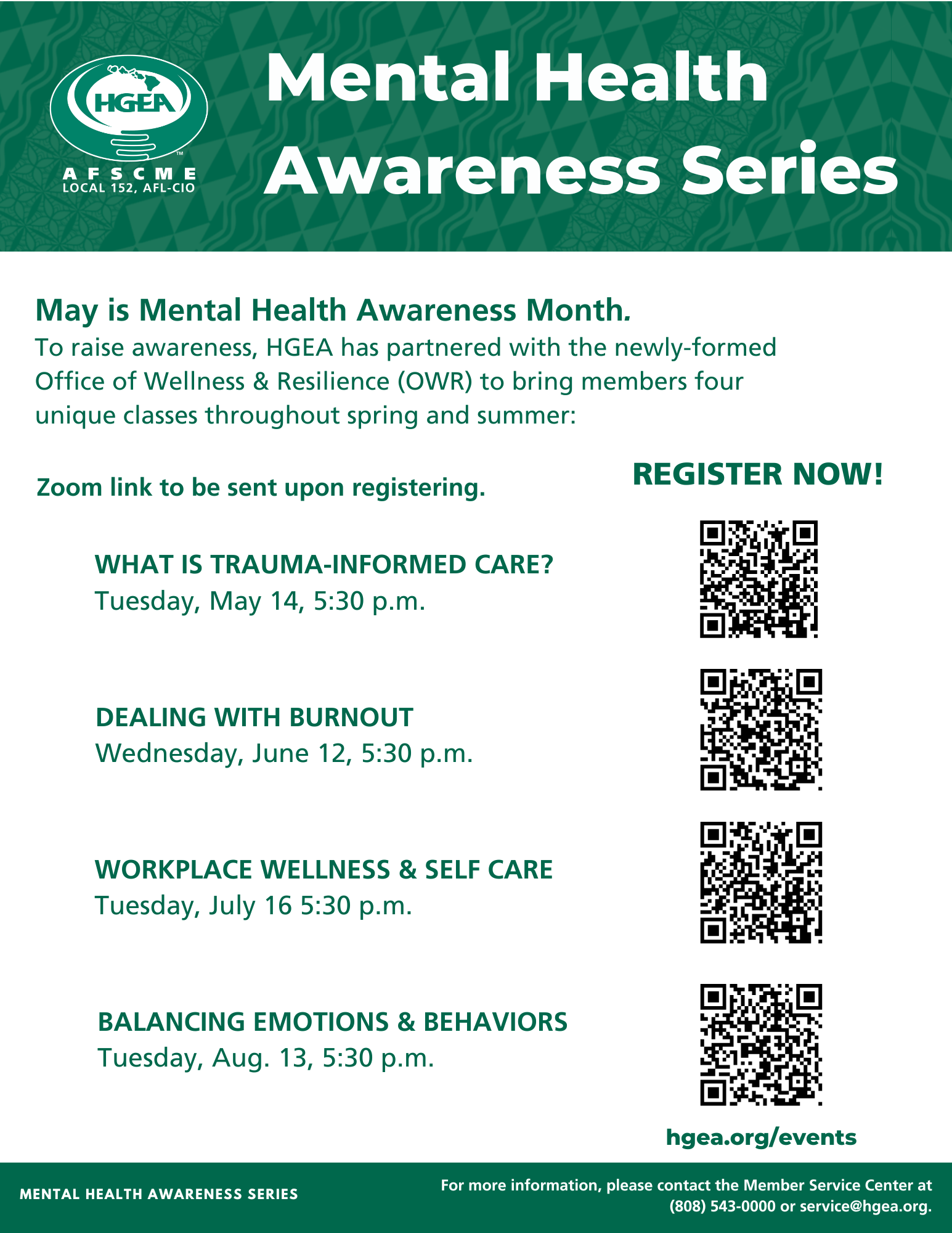 Are you stressed, overwhelmed or dealing with burnout? HGEA has partnered with the Office of Wellness & Resilience to provide members with classes to improve mental health: