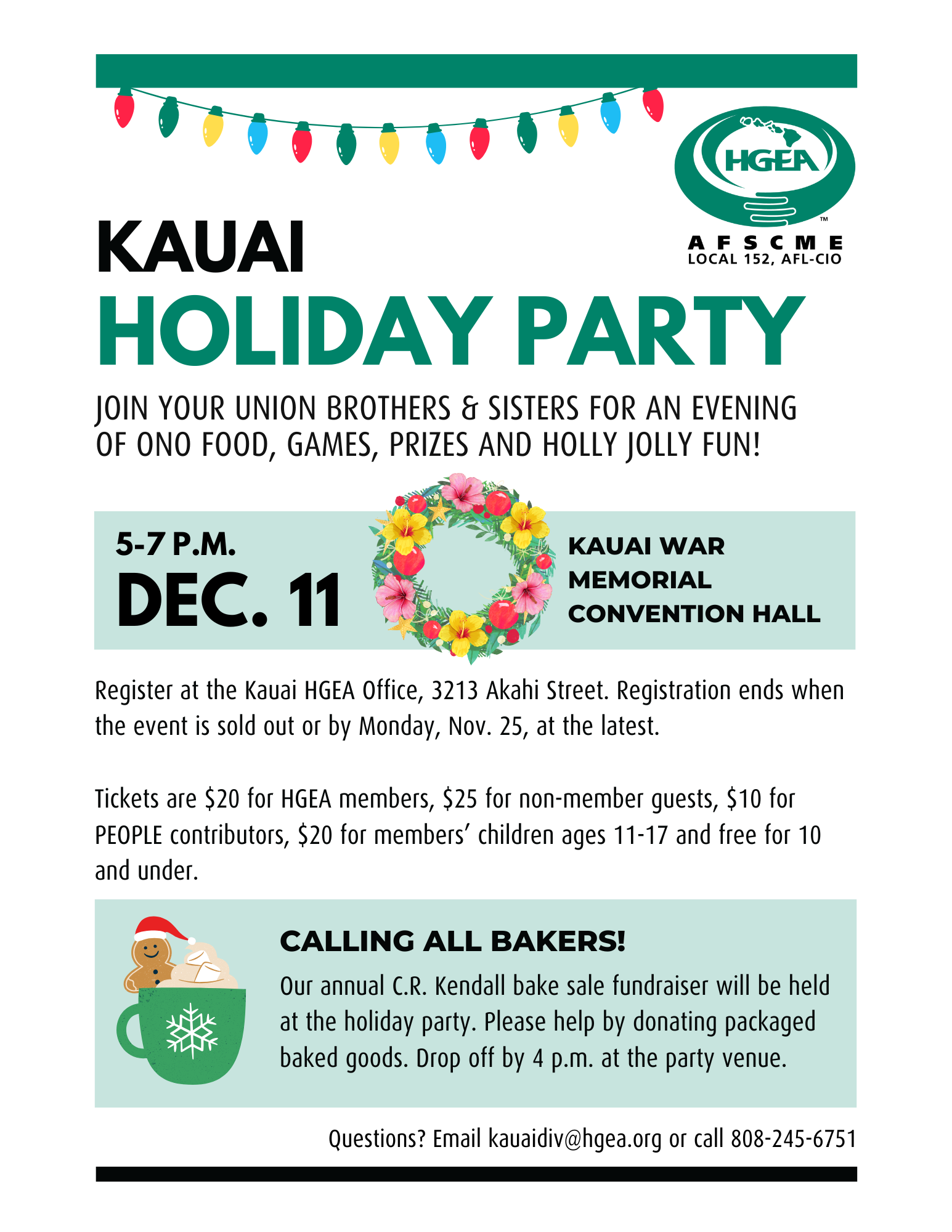 Register by Monday, Nov. 25 at the Kauai HGEA office, 8 a.m. to 4 p.m.,